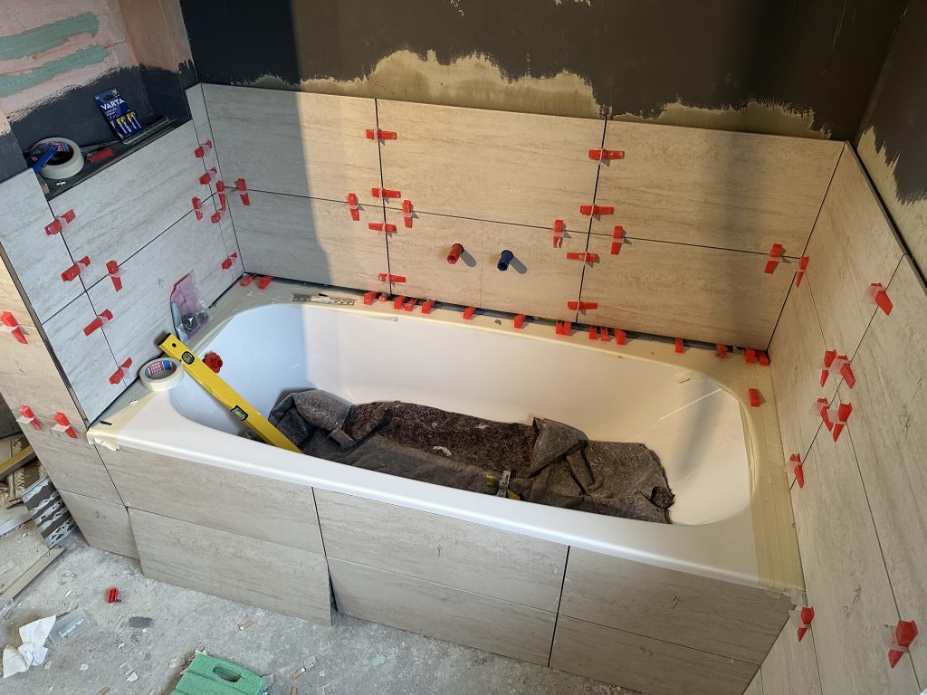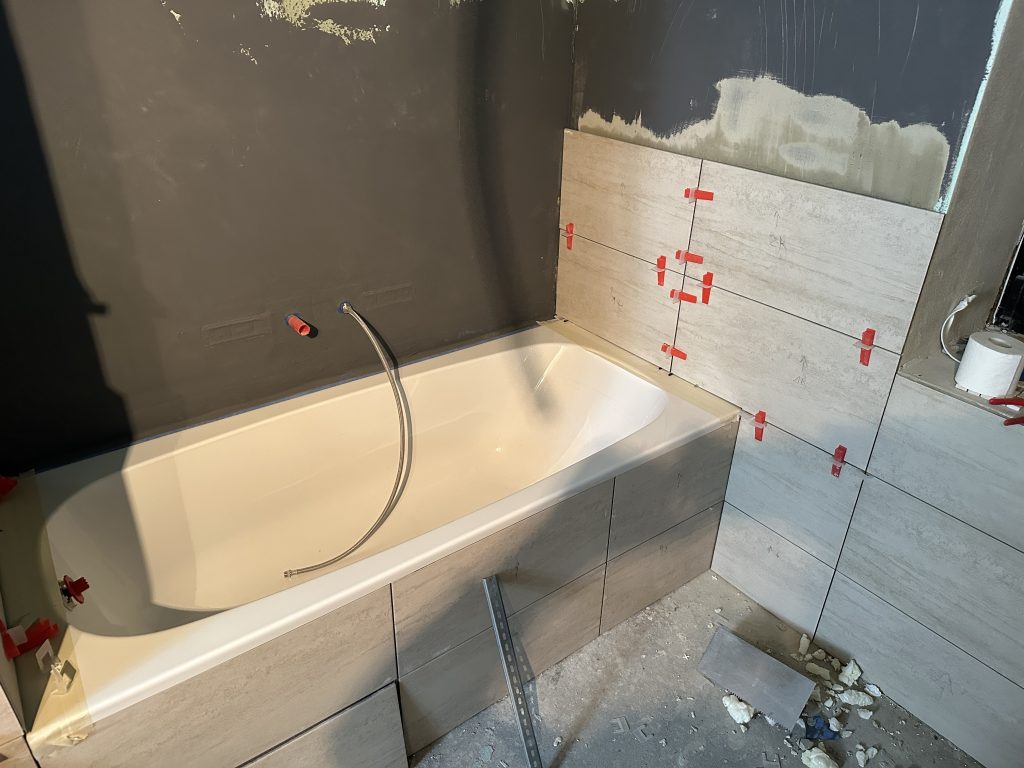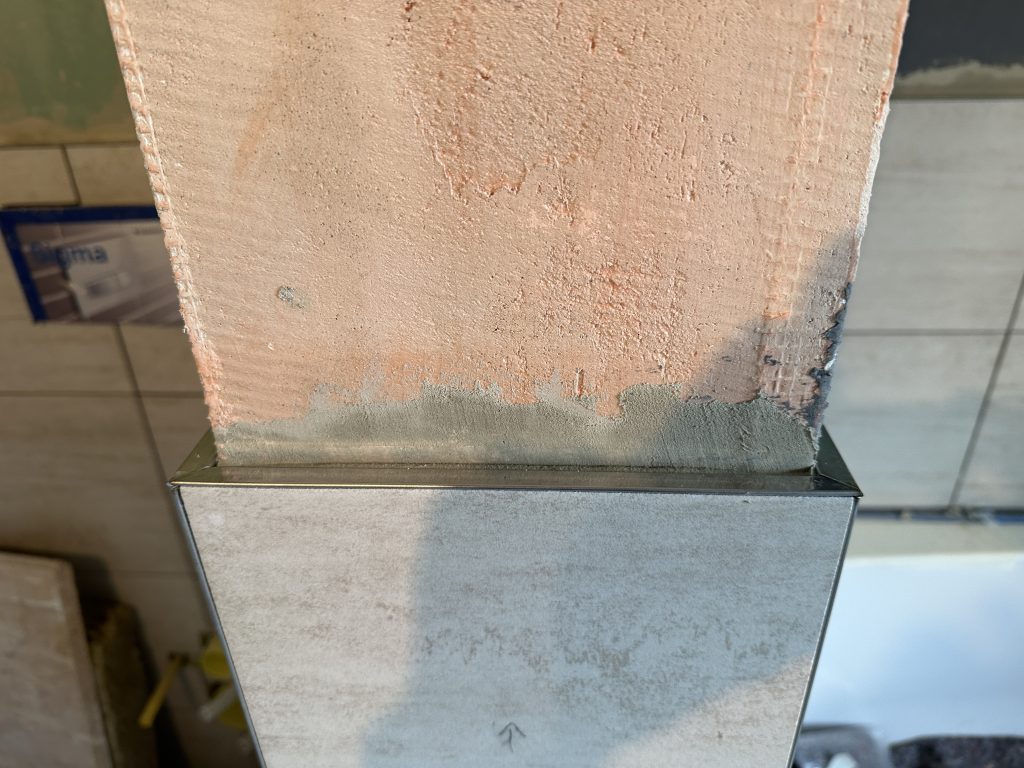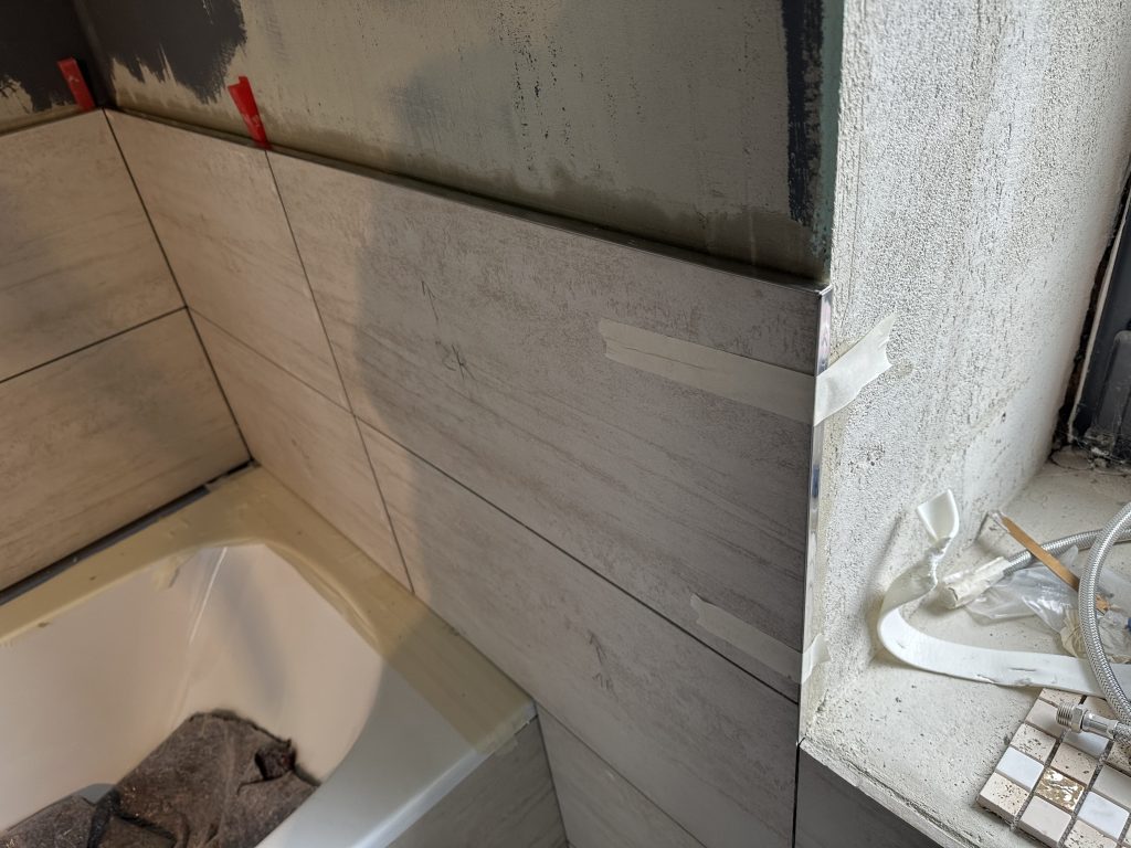 Heute habe ich die letzte kleine Fliese bei der Badewanne im Ausschnitt geklebt. Außerdem beschäftigte ich mich mit sämtlichen fehlenden Edelstahl-Abschlussleisten. Hier um die Badewanne herum.
