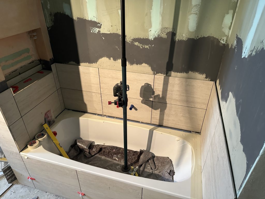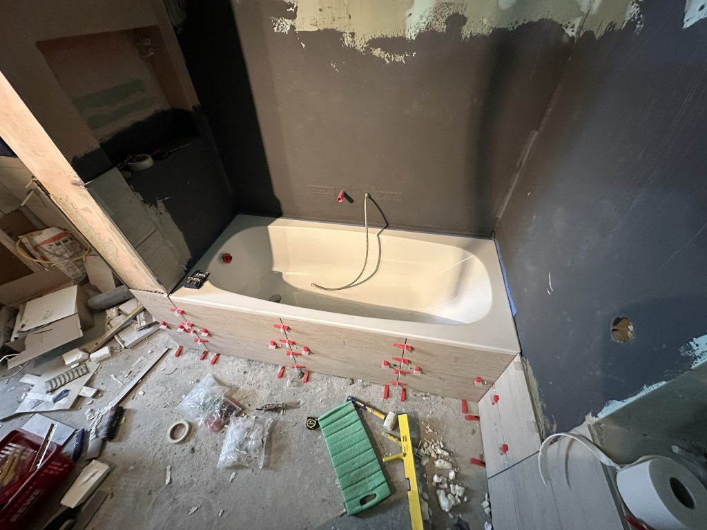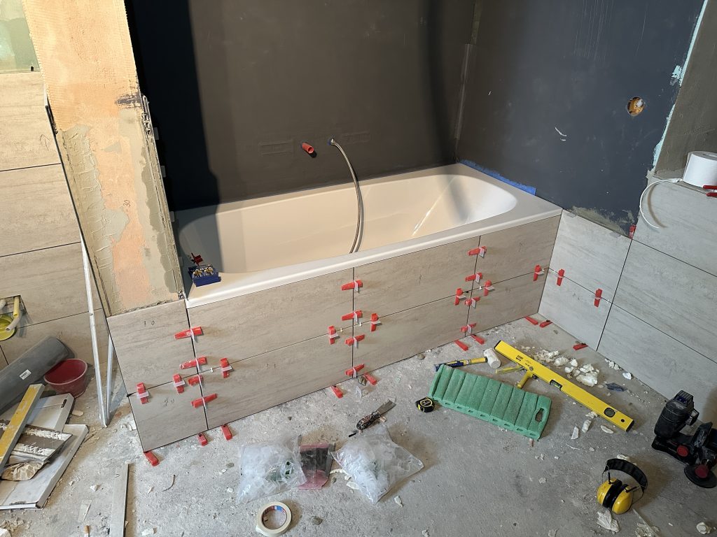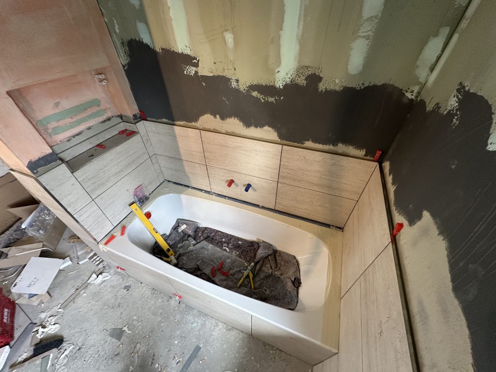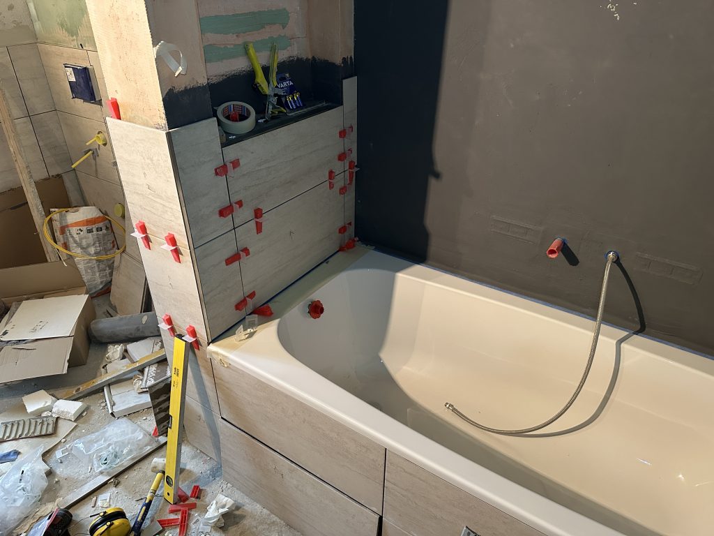Heute habe ich die letzte kleine Fliese bei der Badewanne im Ausschnitt geklebt. Außerdem beschäftigte ich mich mit sämtlichen fehlenden Edelstahl-Abschlussleisten. Hier um die Badewanne herum.