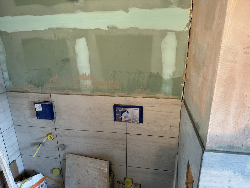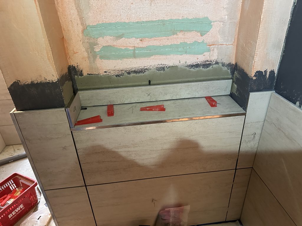 Damit sind die Wand-Fliesen inkl. Leisten fertig verlegt. Abzüglich dem Fliesenpaket welches mittig einmal komplett durchgebrochen ist (Transportschaden) blieben genau 5 Fliesen übrig.