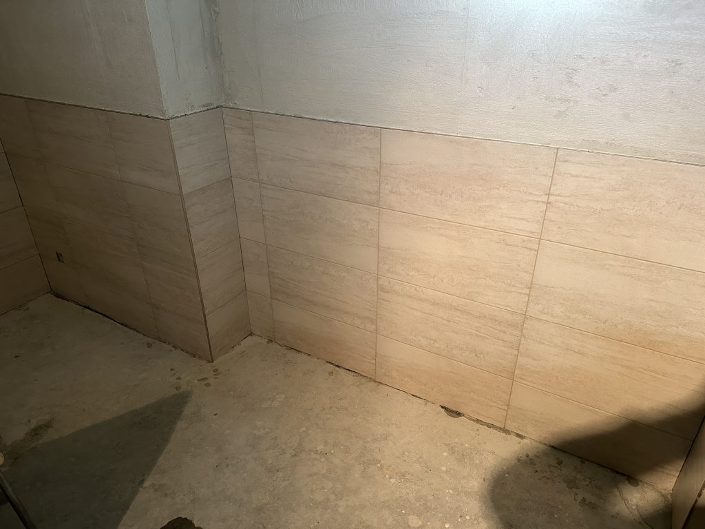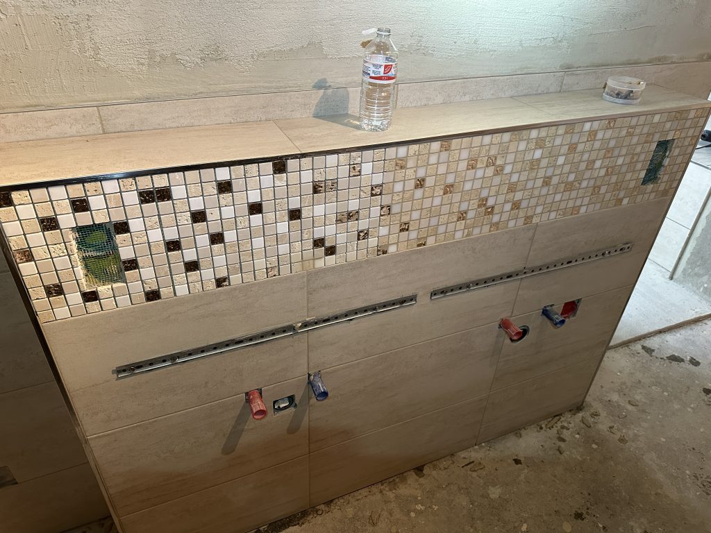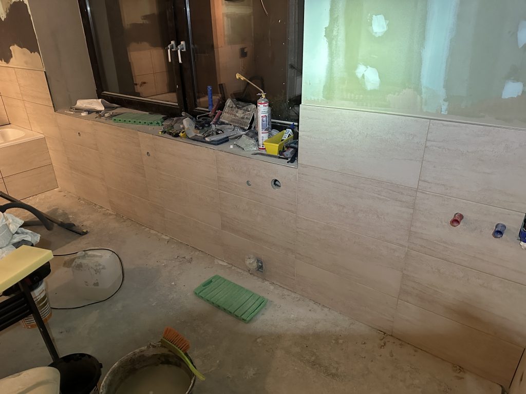 Den Waschtischbereich fast komplett. Bei den Mosaik ist dann die Fugenmasse ausgegangen. Habe jetzt 2 Eimer Fugenmasse nachgekauft.