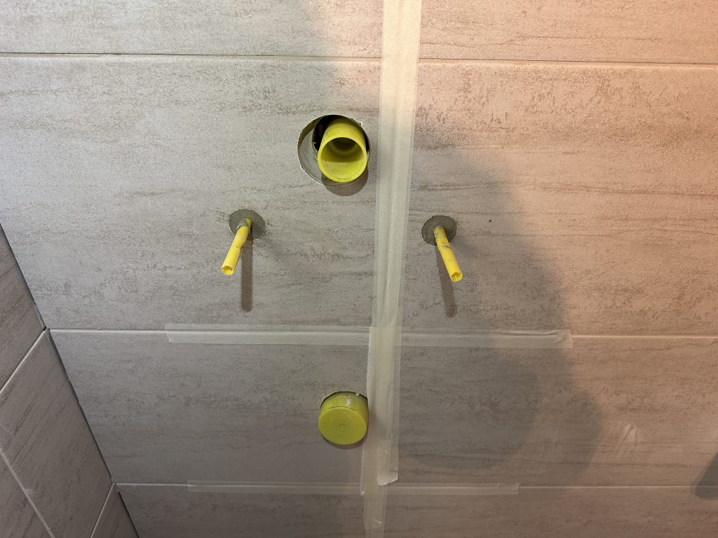 Damit die Halter für das Urinal mehr Auflagefläche haben, etwas Fliesenkleber in die Bohrung gespachtelt.