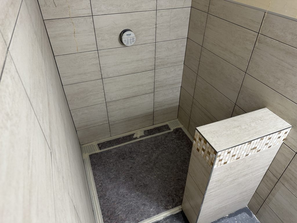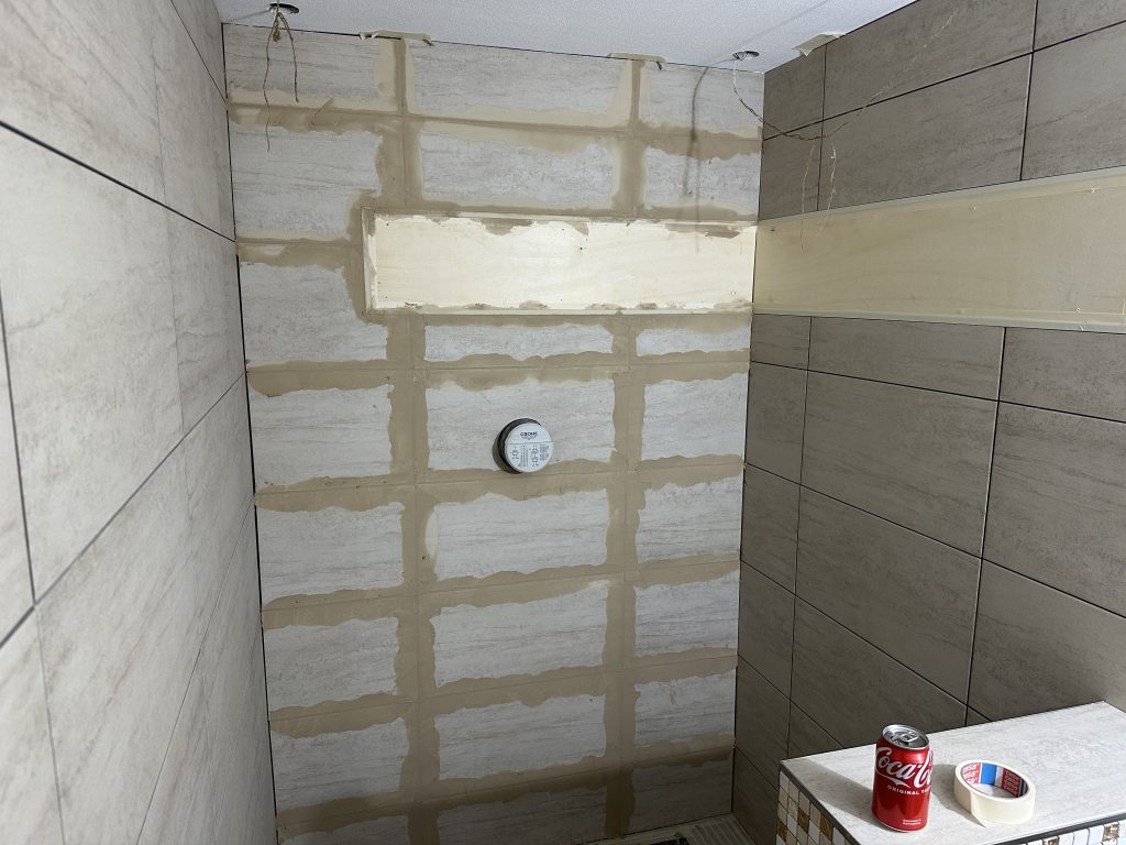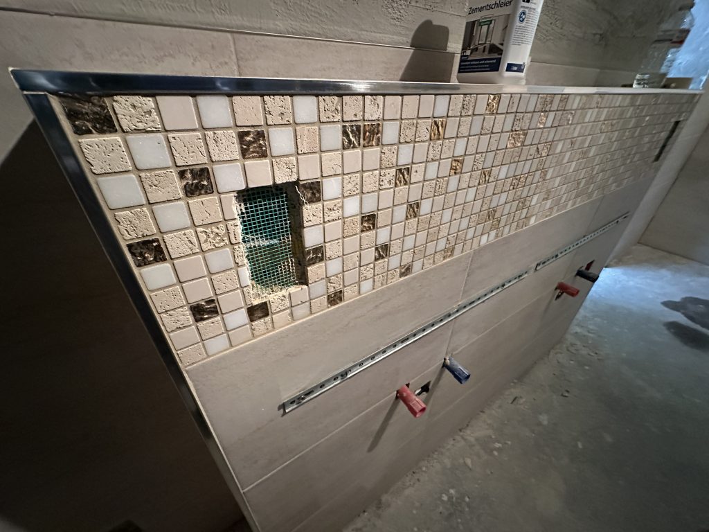 Hier das Ergebnis. Die Wand mit der Armatur ist fertig. Im Duschbereich selbst die linke Wand ebenso.