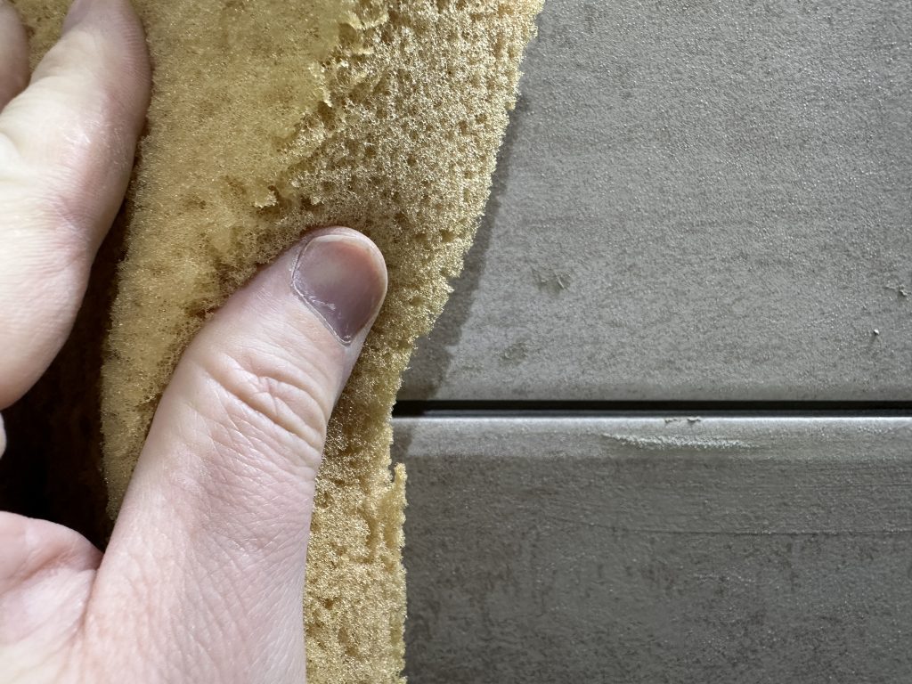 Noch deutlicher werden die Verschmutzungen, wenn man mit einem nassen Schwamm über die Fliese geht.