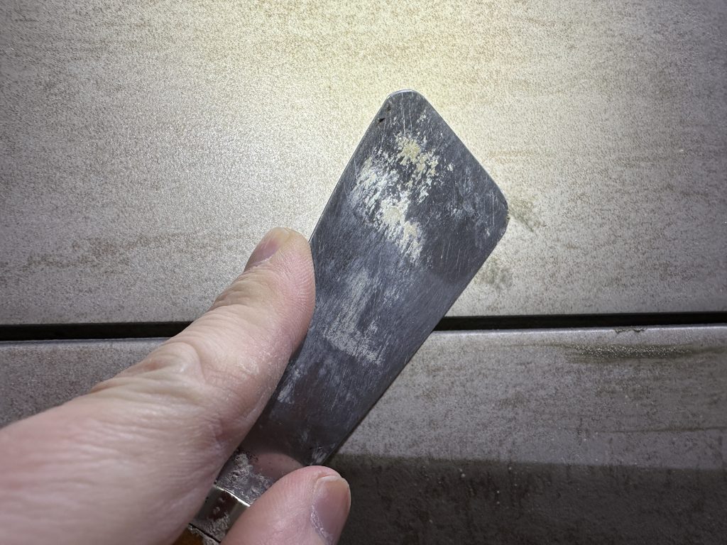 Ansonsten habe ich kleine Löcher (Pinholes). Wahrscheinlich habe ich zu früh emulgiert. Aus diesem Grund habe ich mit dem Verfugen im großen Bad und nicht Dusch angefangen.